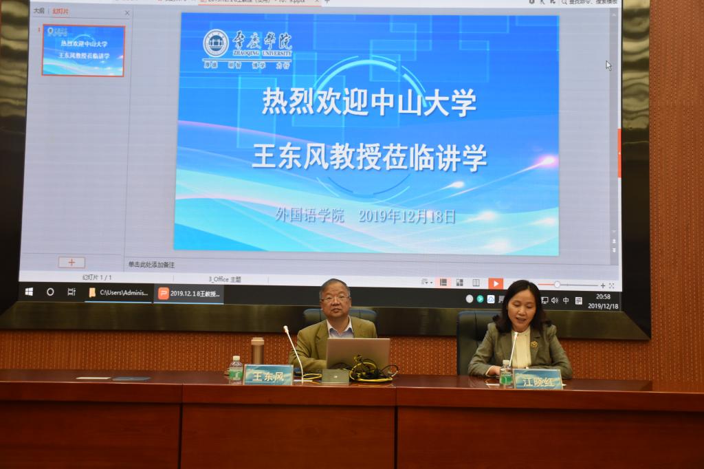 本网讯 2019年12月18日,中山大学外国语言文化学经理、翻译研究中心主任、博士生导师王东风教授应邀莅临公司图书馆学术报告厅,为公司外国语言文化学师生开展了题《翻译与国运兴衰》专题讲座。讲座由外国语言文化学江晓红经理主持。