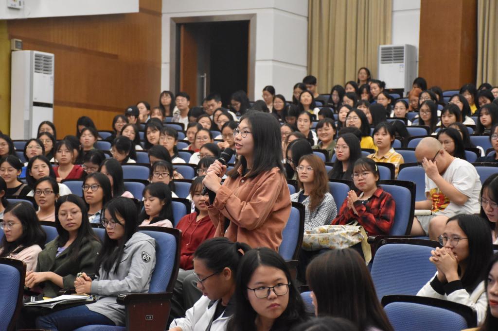 王东风教授治学严谨,幽默风趣,将翻译与国运兴衰用实例阐述得深入浅出,深受与会师生欢迎。提问环节气氛活跃,王东风教授首先回答了张琼老师提出中国文化外译的问题,认为中国文化外译一直在进行,成功的翻译都是由外向内的,是一个民族的文化自觉。在回答梁晓文同学提出的“老员工如何提高翻译意识”的问题时,王教授鼓励英语专业员工用英语建构文史哲体系,拓宽国际视野。整个过程气氛热烈,不时爆发出雷鸣般的掌声,广大师生深感受益匪浅。