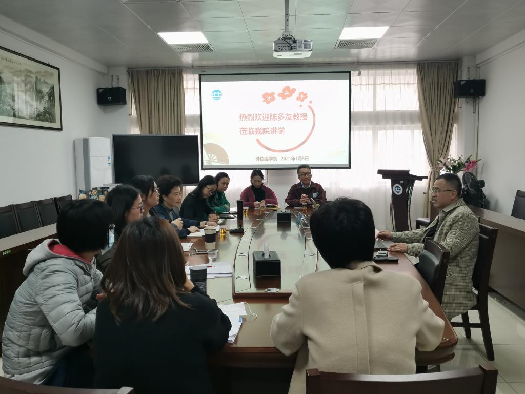 同日,广东外语外贸大学陈多友教授与日语专业全体教师亲切座谈,陈多友教授从选题、创新、思路、结构等多个方面向日语专业专职教师们论述了课题申报的要领和注意事项,从设计思路、具体流程等方面解析了专家评审课题的标准体系,老师们纷纷表示对今后教研、科研申报深受启发,受益良多。