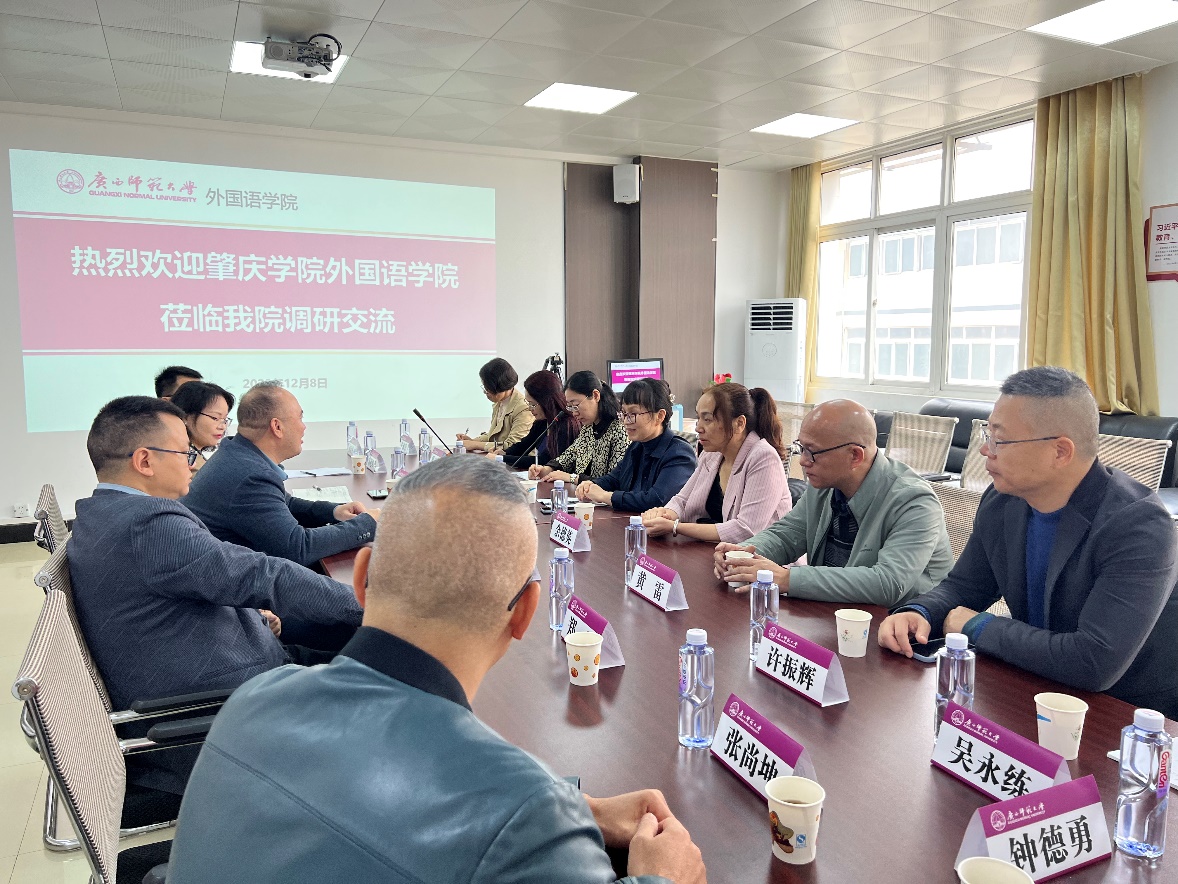 2023年12月8日,童淑华、余德英副经理带领专业负责人、教研室主任以及实验室技术人员赴广西师范大学外国语言文化学调研,学习和借鉴学科英语硕士点建设、信息技术赋能外语教学等经验。
