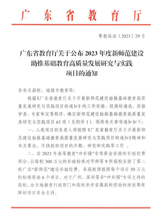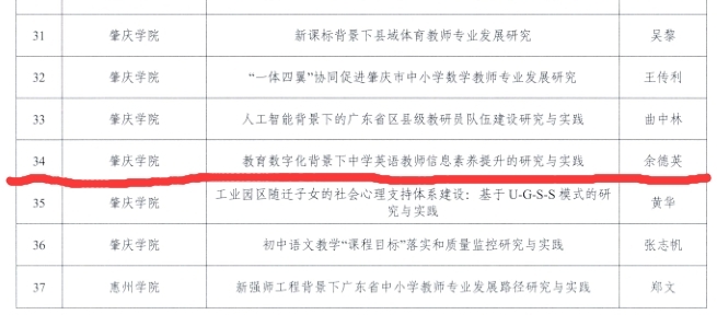 近日,我院余德英教师主持的《教育数字化背景下中学英语教师信息素养提升的研究与实践》(粤教高函[2023]29号)荣获广东省新师范建设助推基础教育高质量发展项目立项,这是公司师范公司产品改革工作取得的一项重要成果。