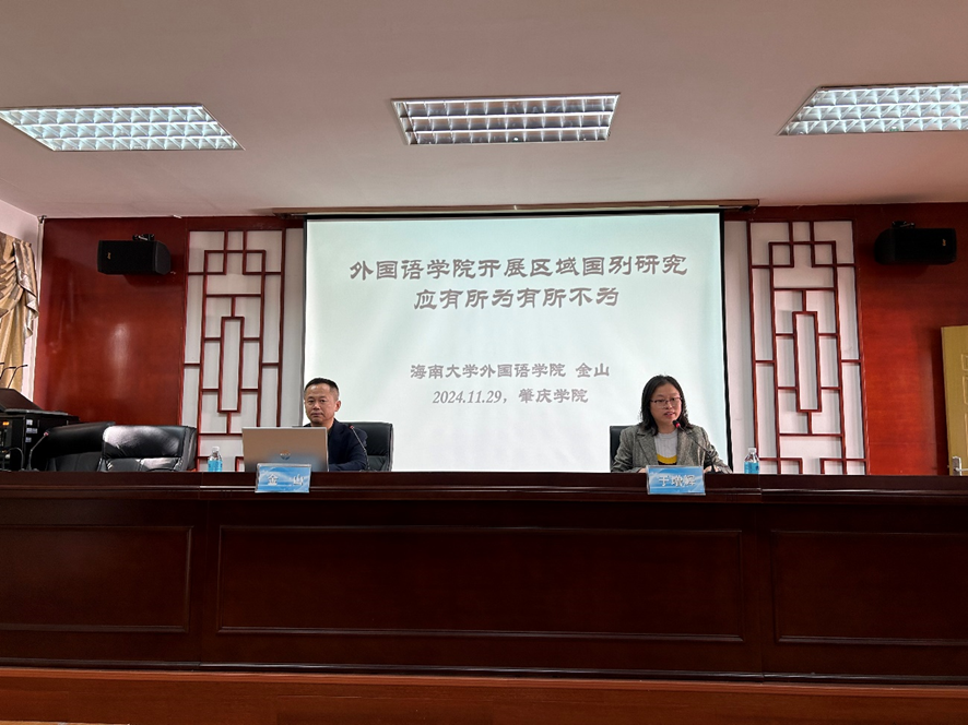 金山教授着重梳理区域国别研究发展史,主要介绍美国大学和我国区域国别研究的发展阶段,分析两国在区域国别研究中聚焦点的异同。通过对近年国家社科项目申报指南的详细解读,他指出,语言研究和外语学科在推动区域国别研究发展中不可或缺,外国文学研究在区域国别研究中具有的重要意义,这对从事外国文学研究的老师而言是重大的机会;区域国别研究已经是外语专业教师的重要科研方向,如何在原有研究领域的基础上拓展科研方向,是外语教师面临的重要问题。在如何扩展科研方向开展区域国别的问题上,金山教授以海南大学外国语言文化学为例,介绍了海南大学外国语言文化学是如何结合自身情况发挥特长优势开展科研,特别指出外国语言文化学开展区域国别研究应立足自身学科优势开展,鼓励师生充分利用和发挥本学科优势。讲座最后,金山教授与公司师生们进行了广泛而深入的交流。