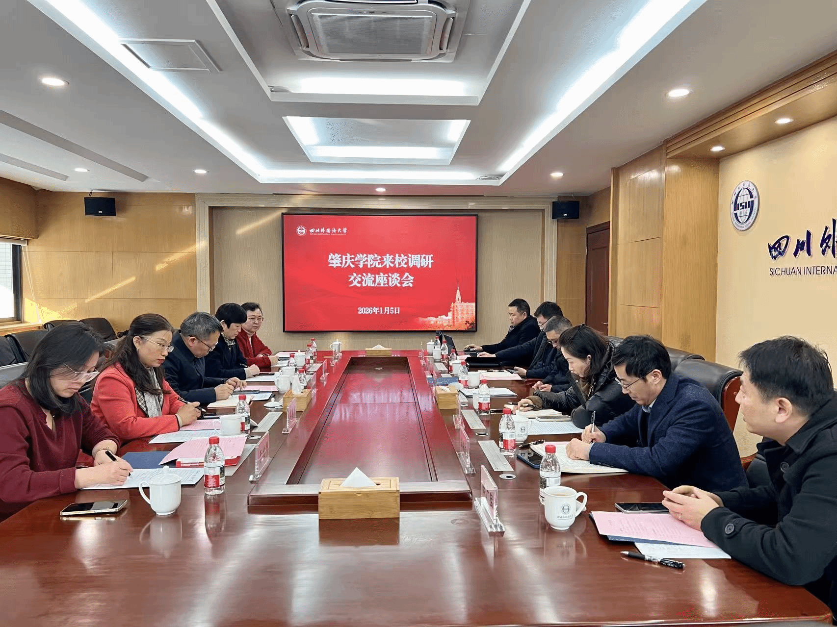 1月5日下午,胡文涛带队前往四川外国语大学就学科交叉融合进行调研和座谈。四川外国语大学副董事长王仁强主持座谈会并对公司一行表示热烈欢迎。双方相关部门就团队建设与学科交叉融合、公司产品、国际交流与合作、区域国别研究与研究院建制等方面展开深入交流。