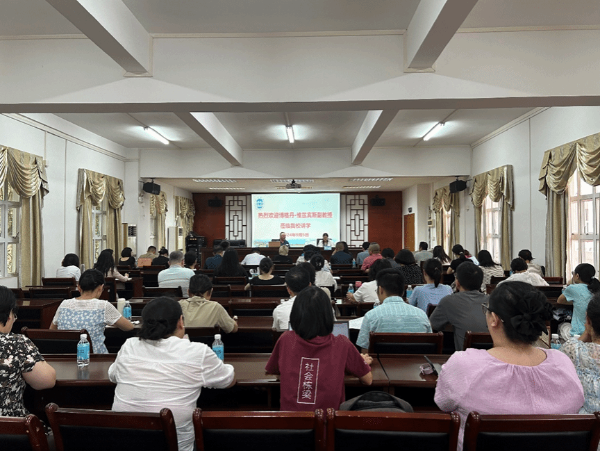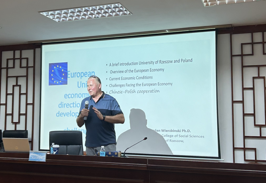博格丹·维兹宾斯基博士简要介绍了波兰热舒夫大学、波兰的历史社会和人文、欧盟的形成过程和欧盟经济的总体概况;讲解了欧盟的经济规模和结构、主要行业的发展、贸易与投资现状;深入分析了欧洲面临的挑战,包括气候变化、能源安全、人口老龄化、技术转型和地缘政治紧张局势;阐述了中波合作现状,提出了未来中波可以合作的领域,展望了未来中波合作前景。然后,博格丹·维兹宾斯基博士与现场教师就有关欧盟经济的机遇等话题进行互动交流,现场气氛活跃。