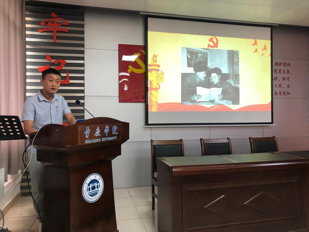 本次活动共有奏唱国歌、观看专题教育片、党员代表发言、党员宣誓、上专题党课和参观党史长廊等六项议程。在雄壮的《中华人民共和国国歌》后,全体与会人员观看了党章专题教育片《共产党员》,一同学习革命先辈们战争年代不怕牺牲、和平年代无私奉献的精神。随后,员工党员代表彭艳发言,分享了追求入党的成长故事,既表达了砥砺奋进的决心,又指出了自身的不足,明确了未来努力的方向。发言后,在英语师范专业员工第二党支部书记王磊老师的领誓下,全体党员面对鲜红的党旗,对党许下庄严的承诺,铿锵有力的宣誓声响彻会场,抒发了党员们对党坚定不移、终生不渝的热爱与忠诚。