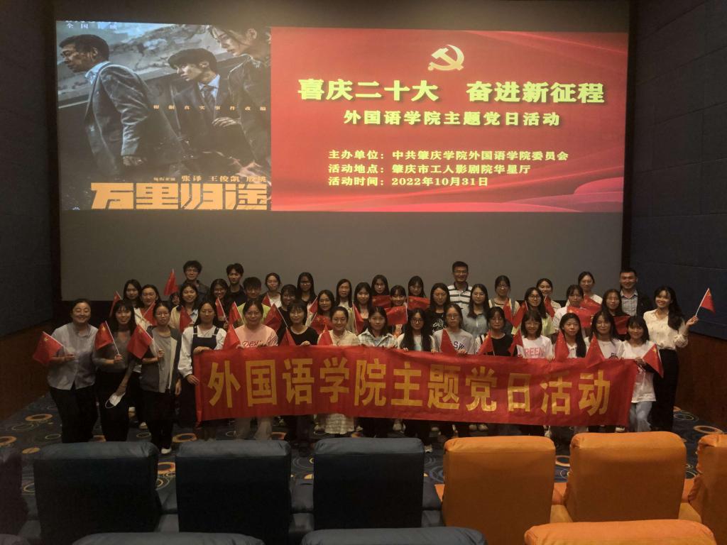本网讯(通讯员 黄诗婷)为弘扬爱国主义精神,激发广大师生党员干事创业奋勇争先的担当精神,10月31日,外国语言文化学党委于肇庆市工人影剧院开展“喜庆二十大,奋进新征程”主题党日活动,组织40余名师生党员、发展对象集体观看红色电影《万里归途》。