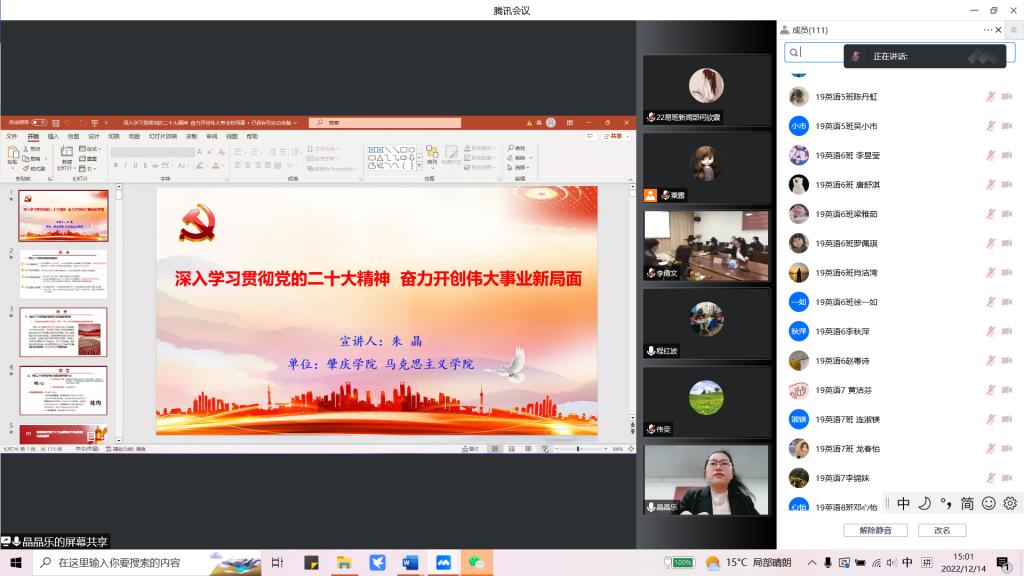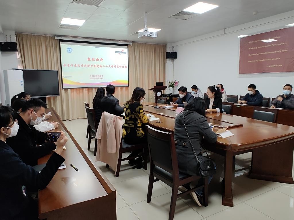 12月14日,为了深入学习宣传贯彻党的二十大精神,外国语言文化学邀请bevictor伟德党的二十大精神宣讲团成员、马克思主义公司教师朱晶,开展题为“深入学习贯彻党的二十大精神 奋力开创伟大事业新局面”的专题宣讲。