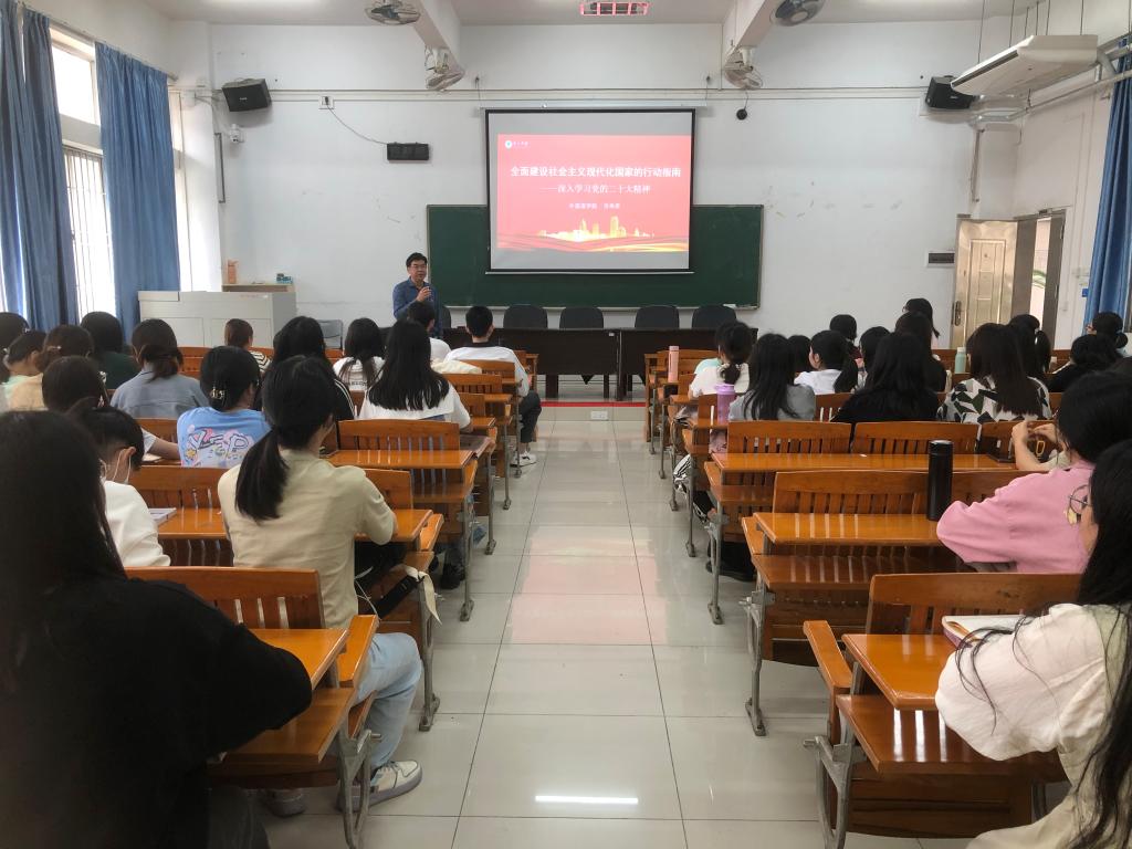 吕伟荣书记与同学们一同回顾了党的二十大的开会时间、地点、大会主题等基本内容,围绕新时代新征程中中国共产党的使命任务和全面建设社会主义现代化国家的谋划安排,对“五位一体”总体布局,“四个全面”战略布局,“十个明确”以及“十四个坚持”等党的二十大报告中所提到的关键词进行了深入阐述。吕伟荣书记认为,学习宣传贯彻党的二十大精神,必须深刻领会过去五年工作和新时代十年伟大变革的重大意义,进一步坚定历史自信、增强历史主动,在深学细悟中赓续精神血脉,在知行合一上践行初心使命。
