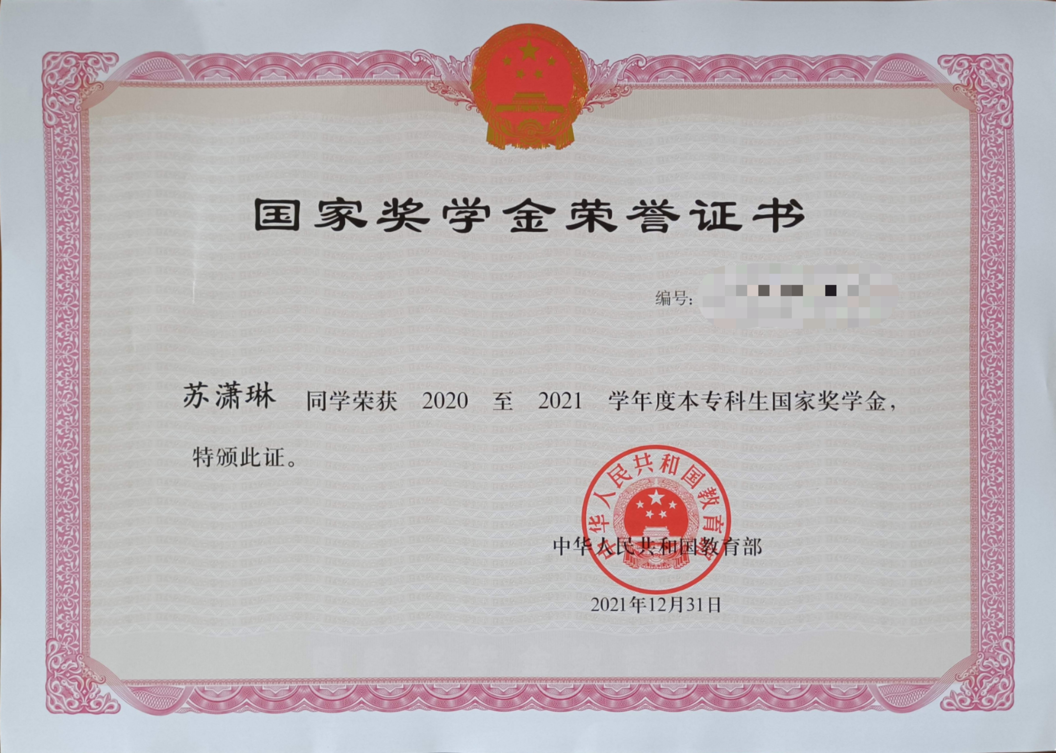 上图:苏潇琳获2020-2021学年度国家奖学金