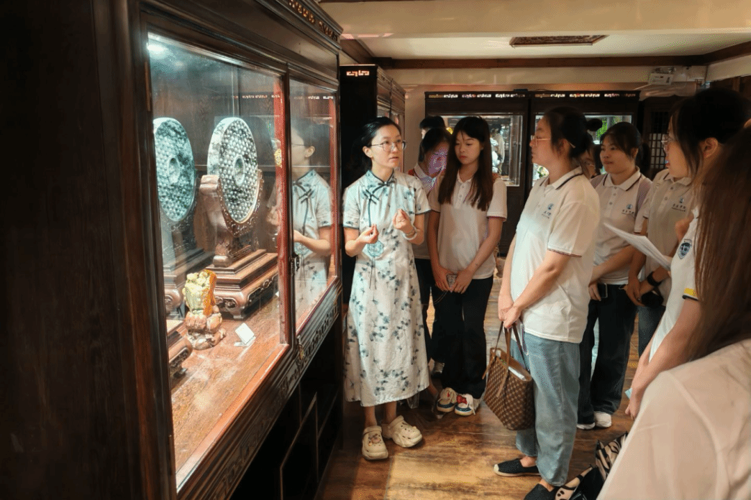 在四会玉雕非遗探寻中,突击队先后走访四会市博物馆、庄家7美术馆、广东省非物质文化遗产生产性示范基地(四会市玉鼎记珠宝有限公司)及文宝斋翡翠博物馆。在四会市博物馆,队员们观赏文物展陈,梳理四会玉雕历史脉络,感受其深厚文化底蕴;于庄家7美术馆,队员们领悟庄家翡翠雕刻理念,与陈国杨馆长探讨玉雕技艺的传承与创新,体会四会玉雕“精、新、巧、韵”的特色与精湛工艺;在玉鼎记珠宝公司,省级非遗传承人张森才先生为队员们系统讲解玉石知识,让大家对玉雕行业现状有了清晰认知;在文宝斋翡翠博物馆,队员们观摩馆藏精品,并采访省级非遗传承人廖锦文馆长,进一步理解玉雕艺术承载的文化内涵。三天的实地调研,队员们从历史渊源、技艺特色、行业现状等多维度深入把握了四会玉雕非遗文化的精髓与价值。