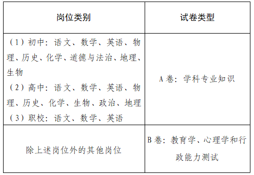 笔试按测试内容分为A、B两种试卷类型。A卷测试内容为学科专业知识,B卷测试内容为教育学、心理学和行政能力测试。具体岗位测试内容见下表: